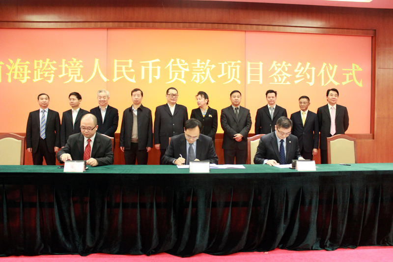 2013年1月28日,艷陽高照,和風送爽,深圳市市民中心B區多功能廳內人潮涌動,喜氣洋洋。前??缇橙嗣駧刨J款項目簽約儀式在此舉行。15家在香港經營人民幣業務的銀行和15家前